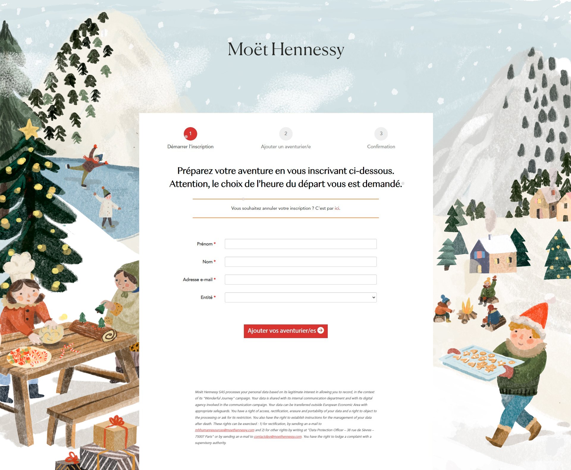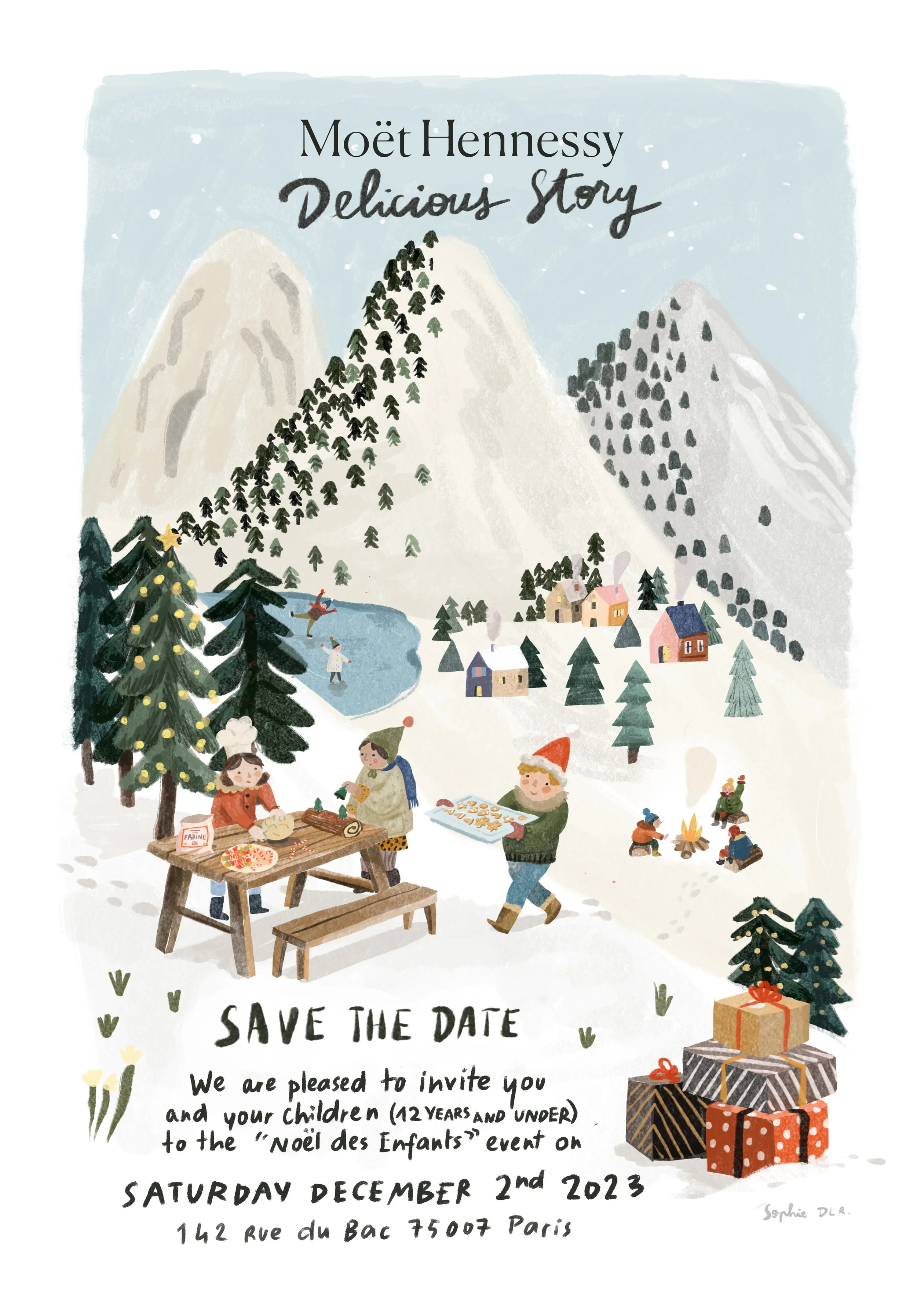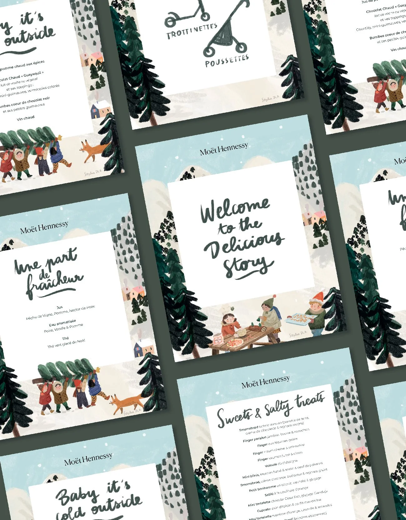 Illustration of the Moët Hennessy group's Christmas invitation. Creation of communication and signage elements for the day of the event